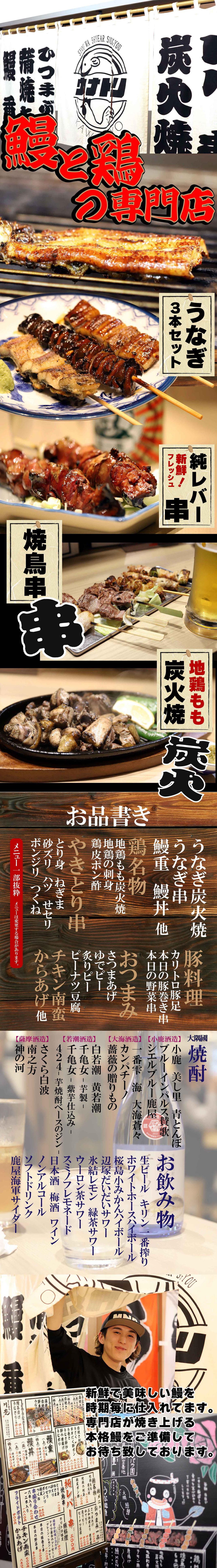 大隅・鹿屋(かのや)で創業約40年の歴史を持つ、うなぎ・地鶏料理の専門店。鹿児島はうなぎの生産量も全国一位。鮮度抜群の朝採れうなぎを、毎朝お店で捌いて提供しています。良質な備長炭で焼き上げた食材は、旨味を逃がさず外はパリッと香ばしく最高の味わいに。鹿児島うなぎ・地鶏を満喫するさまざまなメニューの他、大隅のご当地焼酎や、映画「永遠のゼロ」の舞台となった鹿屋の海軍にちなんだ「鹿屋海軍ハイボール」もぜひ。